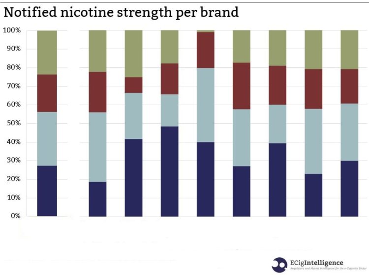 The top e-liquid brands each have a distinctive range of notified nicotine strengths as highlighted by this graphic. The full TPD notification report for Italy provides insights into the notified categories in Italy – such as disposable devices,...