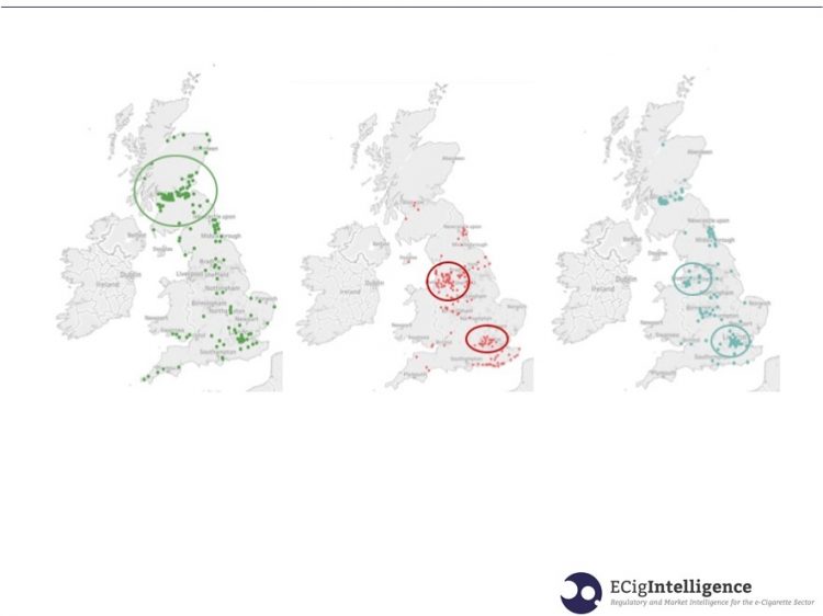 ECigIntelligence has mapped the locations of the biggest vape store chains in the UK. The analysis has revealed that each of these chains tend to concentrate in specific regions as shown on the map.