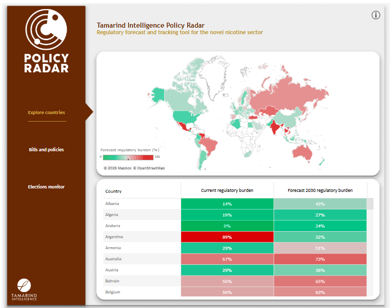 The Tamarind Intelligence Policy Radar provides detailed analyses and comparisons of the current regulatory frameworks and five-year forecasts for a broad selection of leading vapour and novel tobacco markets globally.